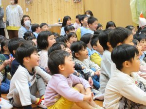 保育者が演じる『白雪姫』のお話に歓声をあげながら見入る子どもたち。