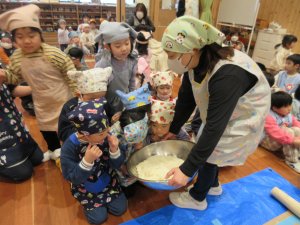 蒸したてのもち米の香りに包まれながら、5歳児さんが頑張ります!