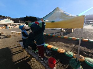 テントの屋根にある雪を知恵を絞って集めようとしていました。