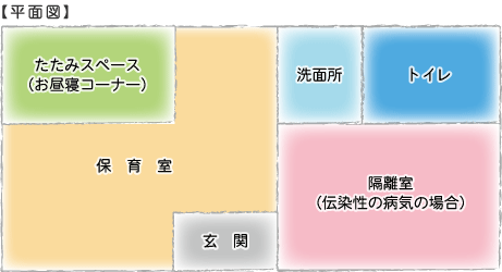 『病気回復期の小学校3年生までの児童を専用の保育室で看護師・保育教諭がお預かりします。それぞれの子どもの体調や個々の気持ちを受け止めて、ゆったりとした環境と家庭的な雰囲気の中で回復期をあたたかく見守り、安定して過ごせるように心がけています。』