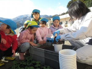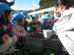 優しく声をかけてもらいながら、そっと大事に苗を植える子ども達。