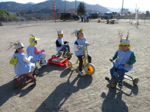 園庭に落ちていた杉の葉を頭につけて、トナカイ気分の5歳児さん。