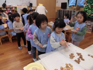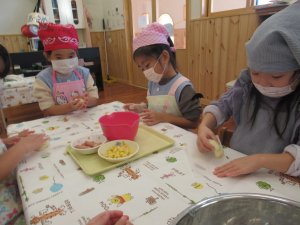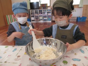 4歳児さんでは、卵不使用のクリスマスクッキー作りを行いました。