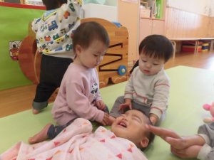 少しずつ仲間意識が芽生えてきている0歳児さんです。