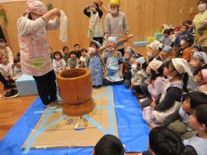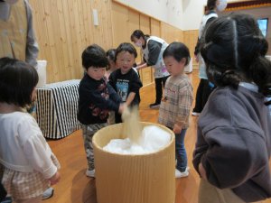 蒸したてのもち米の香りに包まれながら、5歳児さんが頑張ります!