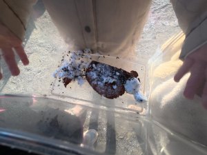 夏にはバッタやカマキリが入っていた虫かごには、小さな雪だるま⛄
